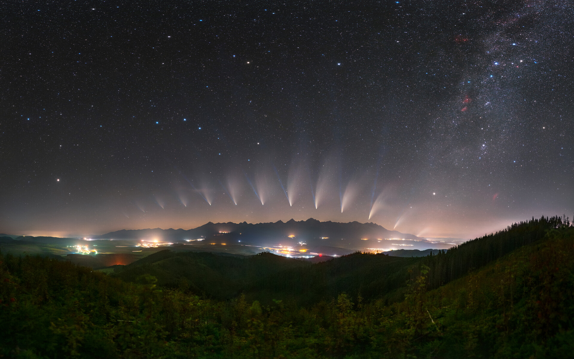 This image uses the chronophotography technique to capture the evolution of the comet C/2020 F3 (Neowise) over time, as it became visible in the northern skies in July 2020. Orbits of comets are extremely elliptical, which means that during part of their orbit they get close to the Sun. As a comet approaches the Sun, it gets heated, releases gas and dust creating an envelope or coma around the nucleus. The solar wind and photons (particles of electromagnetic radiation) interact with the coma producing the cometary tail, which can be seen clearly in this image. The tail of a comet always points away from the Sun, and extends as much as tens of millions of kilometres. This tail has two parts: the relatively straight bluish gas (ion or plasma) tail, which is made up of charged particles interacting with the magnetic fields of the solar wind; and the whitish dust tail compose of very small dust particles that are pushed by the radiation pressure from the Sun into a curve due to their slower speeds. Two regions in the Solar System are often associated with being “storehouses” of comets: the Kuiper Belt and the Oort Cloud. Comets with periods up to about two hundred years come from the Kuiper belt, a reservoir of cometary nuclei material with a disk-like shape located beyond Neptune. Longer period comets come from the Oort cloud, another huge reservoir of icy objects, with a spherical shape surrounding the Solar System. The outer limit of the Oort Cloud is not known as yet, but it could be as much as 10 thousand times the Sun-Earth distance, or even more. Due to gravitational disturbances, some of these cometary nuclei might be ejected towards the inner regions of the Solar System, sometimes approaching the Earth, offering some of the most spectacular views of a celestial body. The image also shows some prominent constellations and asterisms like the Big and Little Dippers, and also the North (Pole) Star – Polaris. This mosaic image was taken in different locations in Slovakia, Czech Republic and Greece from 9th of July 2020 (first comet image on the right) and 2nd of August 2020 (last image of the comet on the left), and finally stacked with a background image taken from the Kozi Kamen mount in Slovakia.