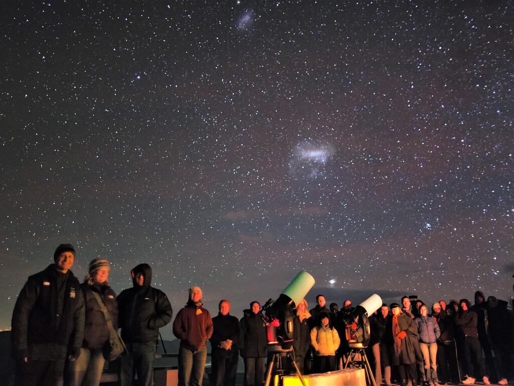 The two Magellanic Clouds above a star party in the southern hemisphere.