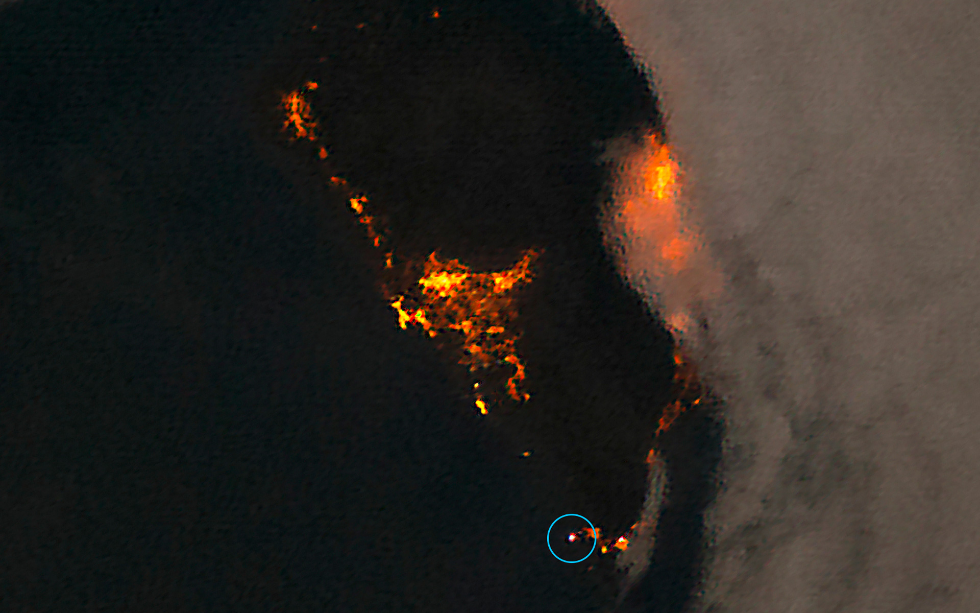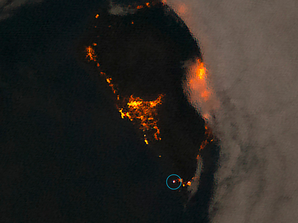 The image shows the potential of using ISS images to detect lighting installations that are not allowed near observatories. On the island of La Palma, the use of white light is forbidden by observatory protection laws. One candidate violation can be spotted on this image and is marked with a green circle.